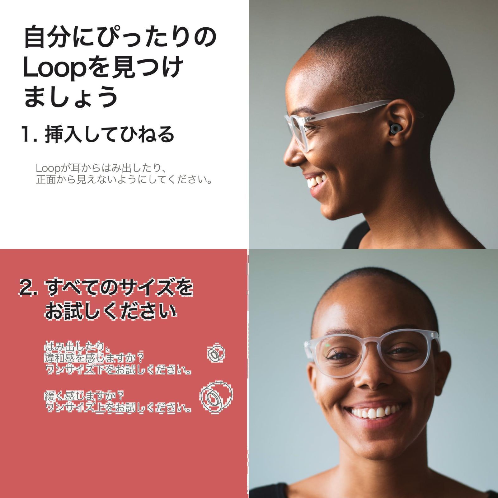使いやすい リーズナブルで、どなたにも使いやすい、Loop Experience Plus。使い方は簡単。正しくつければ耳に収まり、ジャマになりません。4サイズ (XS~L)のイヤチップ付属。ループ部分がはみ出したり、痛みを感じる場合は、小さいチップに替えてください。密閉感がなく、音が小さくならない場合は、大きめのサイズをお試しください。